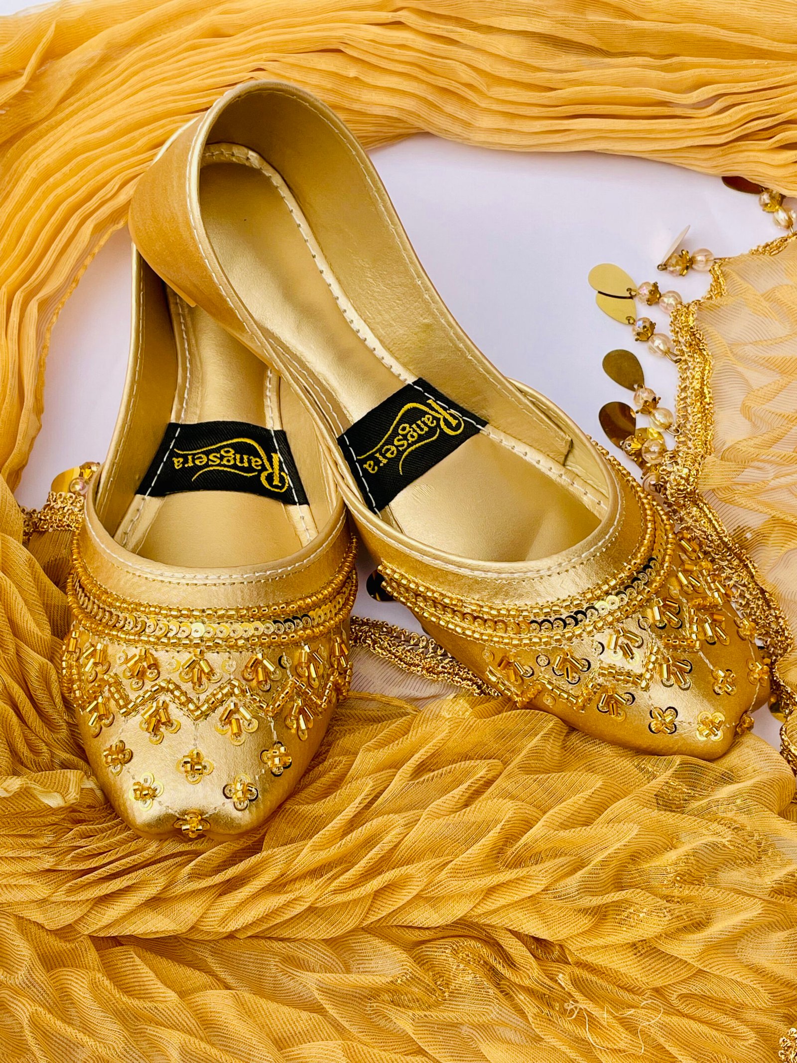 The Light Golden Pearl Khussa is a graceful handcrafted footwear featuring a soft light-golden rexine upper with delicate pearl (moti) embellishment. Its minimal yet elegant design makes it ideal for those who prefer subtle traditional style. The jelly sole ensures comfort, flexibility, and lightweight wear, making it suitable for festive, formal, and traditional gatherings.