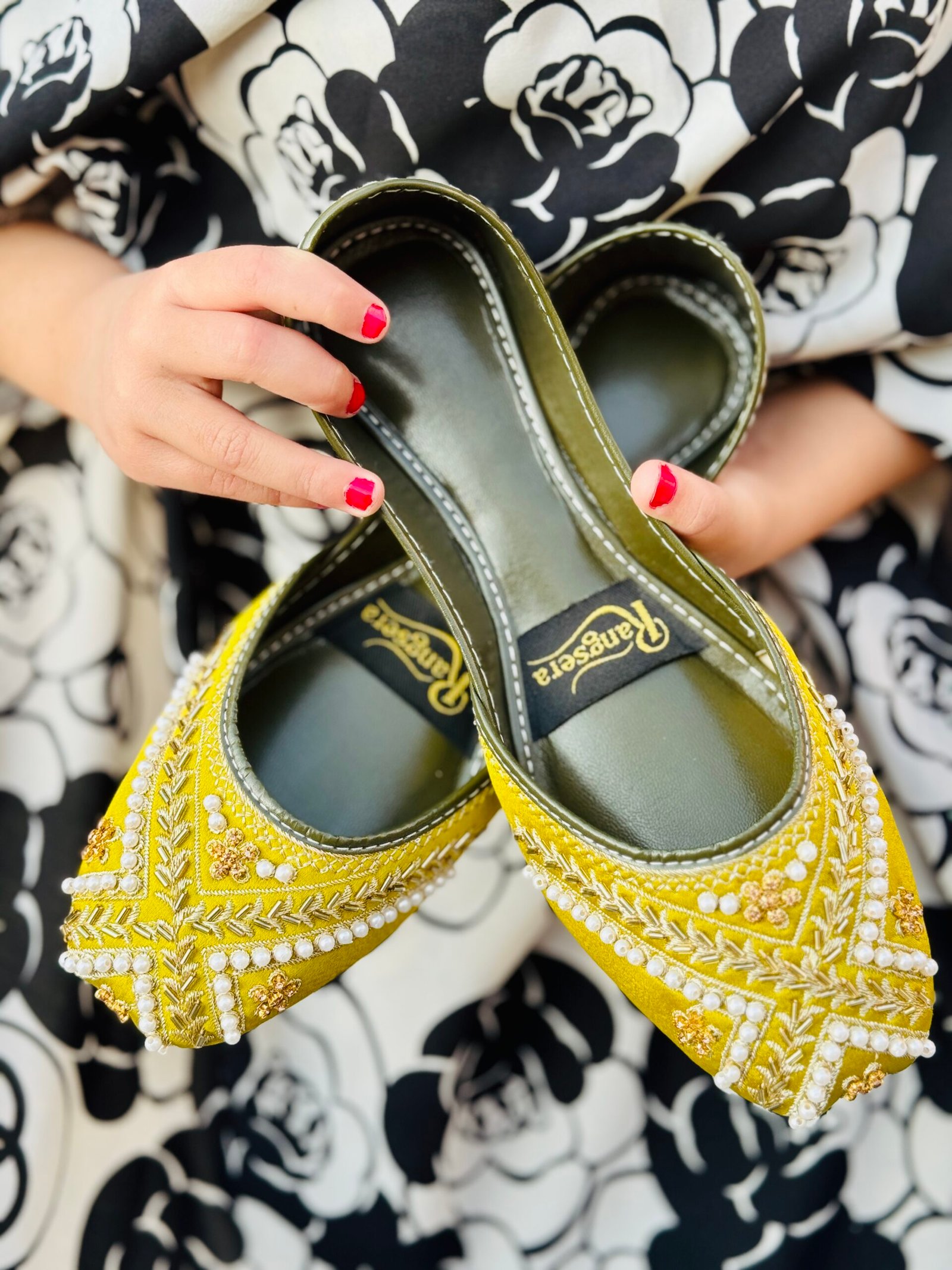 Fresh, vibrant, and full of charm, Mehraya (Apple Green) brings a lively elegance to traditional footwear. Crafted in a refreshing apple green shade, this khussa is beautifully detailed with delicate pearl embellishments and fine metallic embroidery that add a graceful sparkle. The bright hue pairs effortlessly with festive and daytime looks, while the soft, cushioned sole ensures comfort without compromising on style.