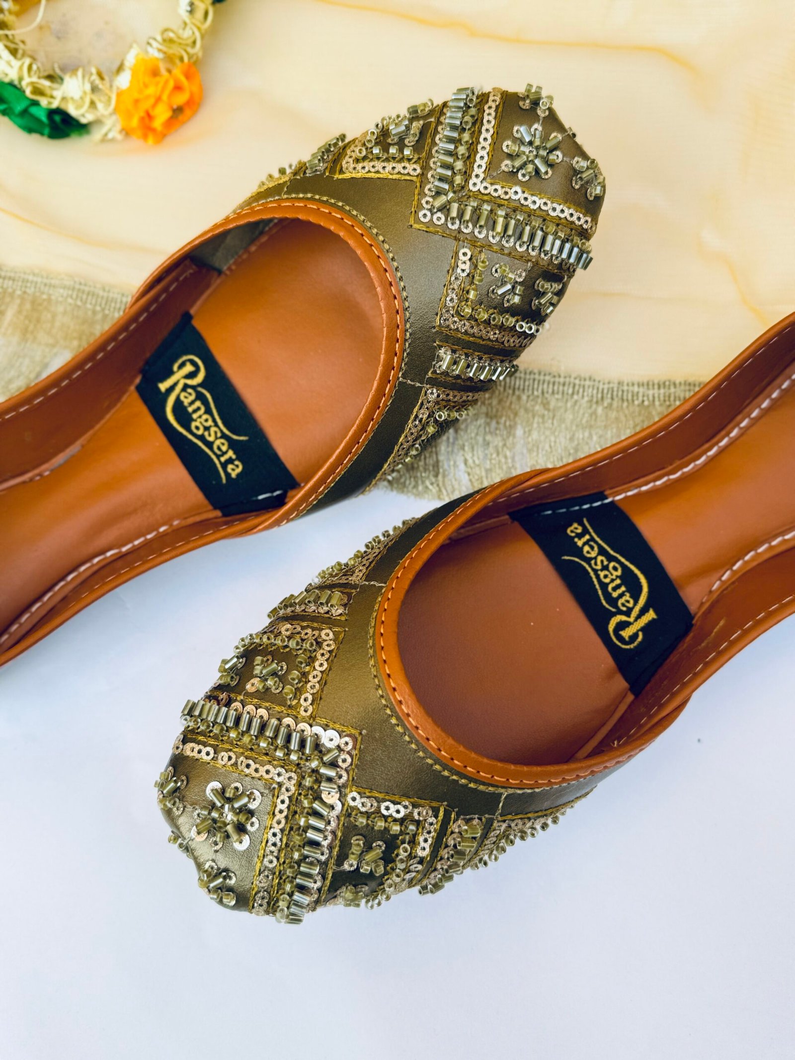 Zariya (Antique Gold) is a handcrafted khussa featuring a rich antique gold tone with intricate traditional handwork. The detailed bead and sequin embellishment creates a luxurious textured pattern, giving this pair a classic eastern look with a royal touch. Perfect for weddings, festive wear, and formal traditional outfits.