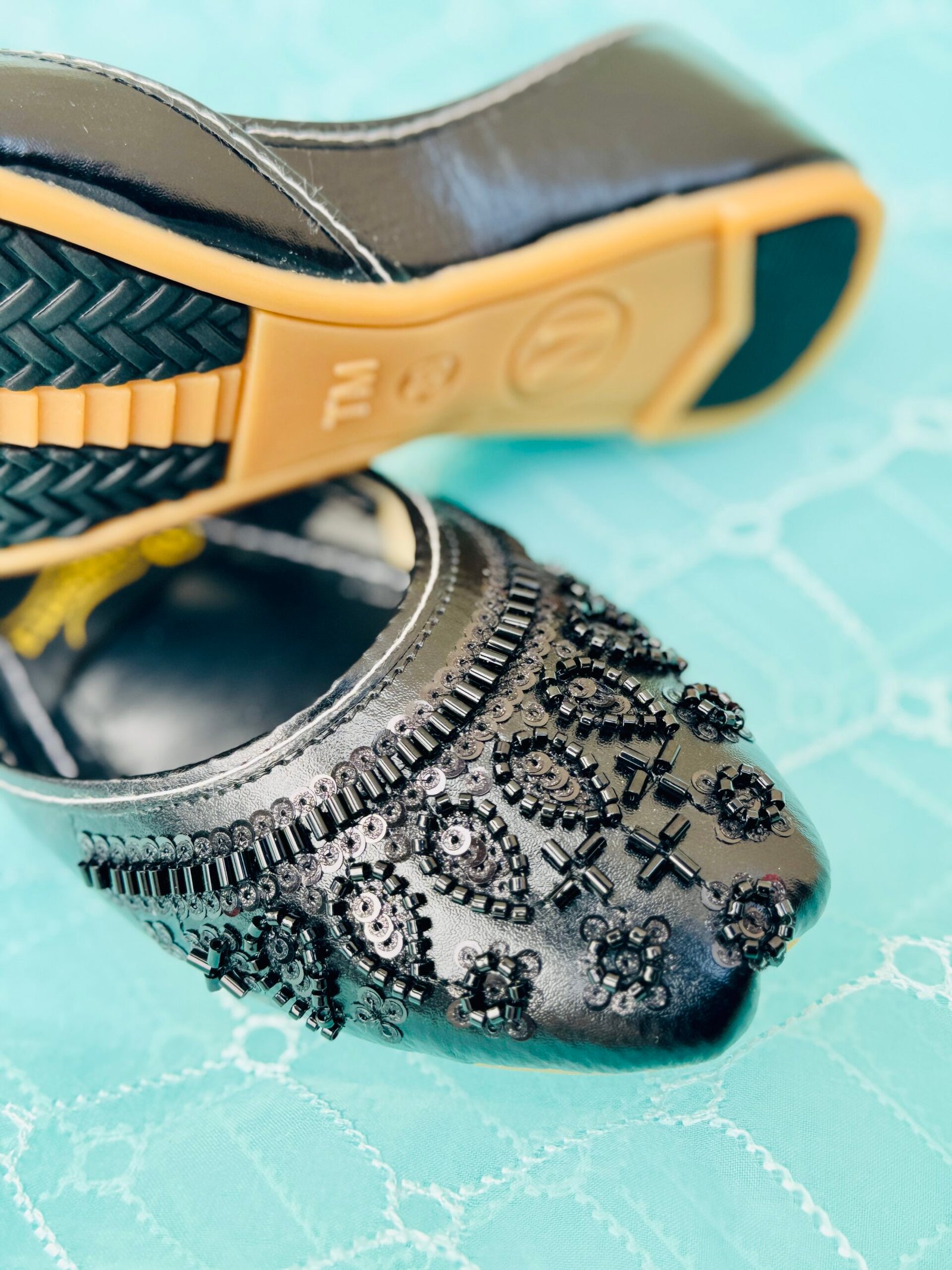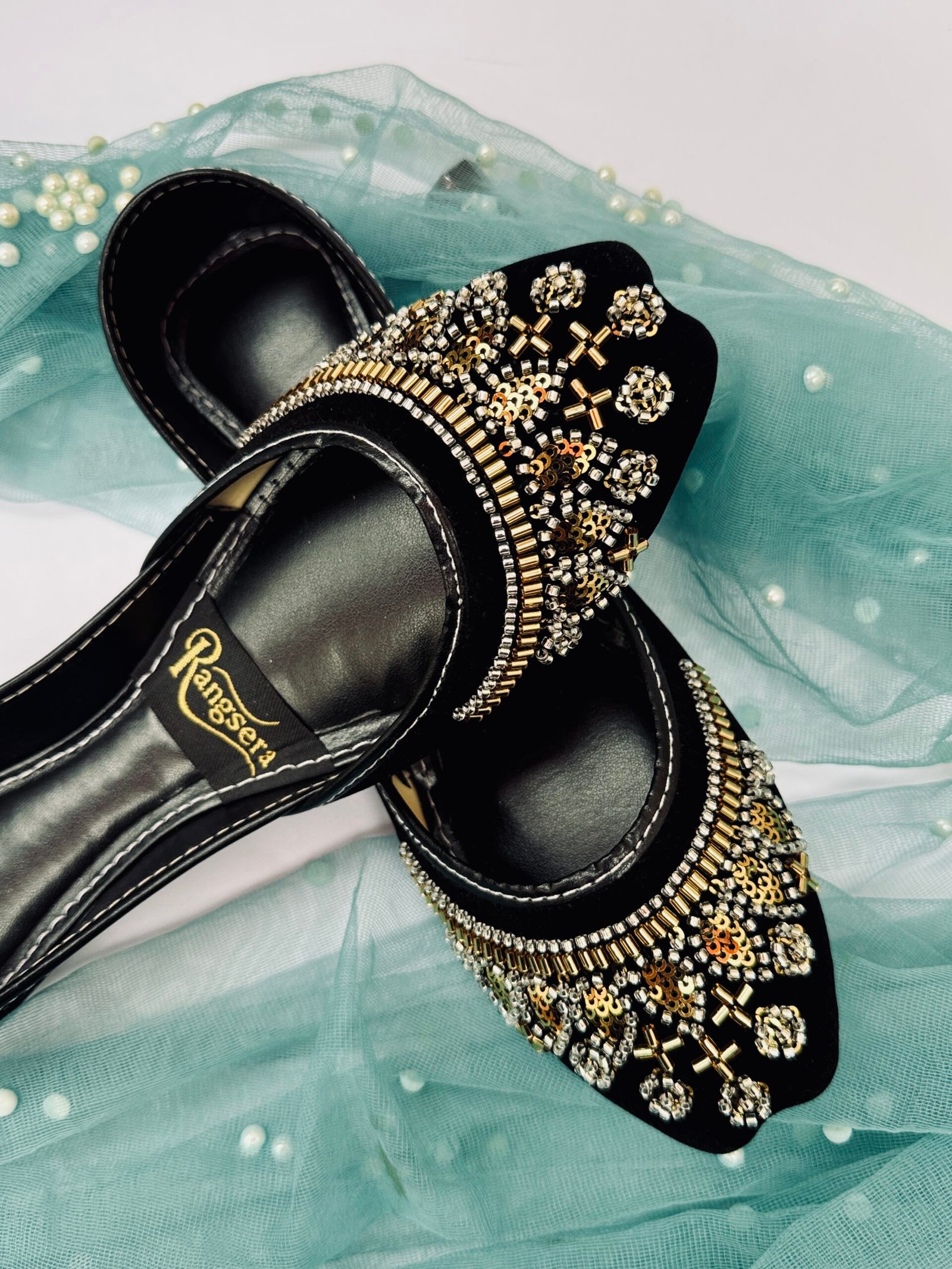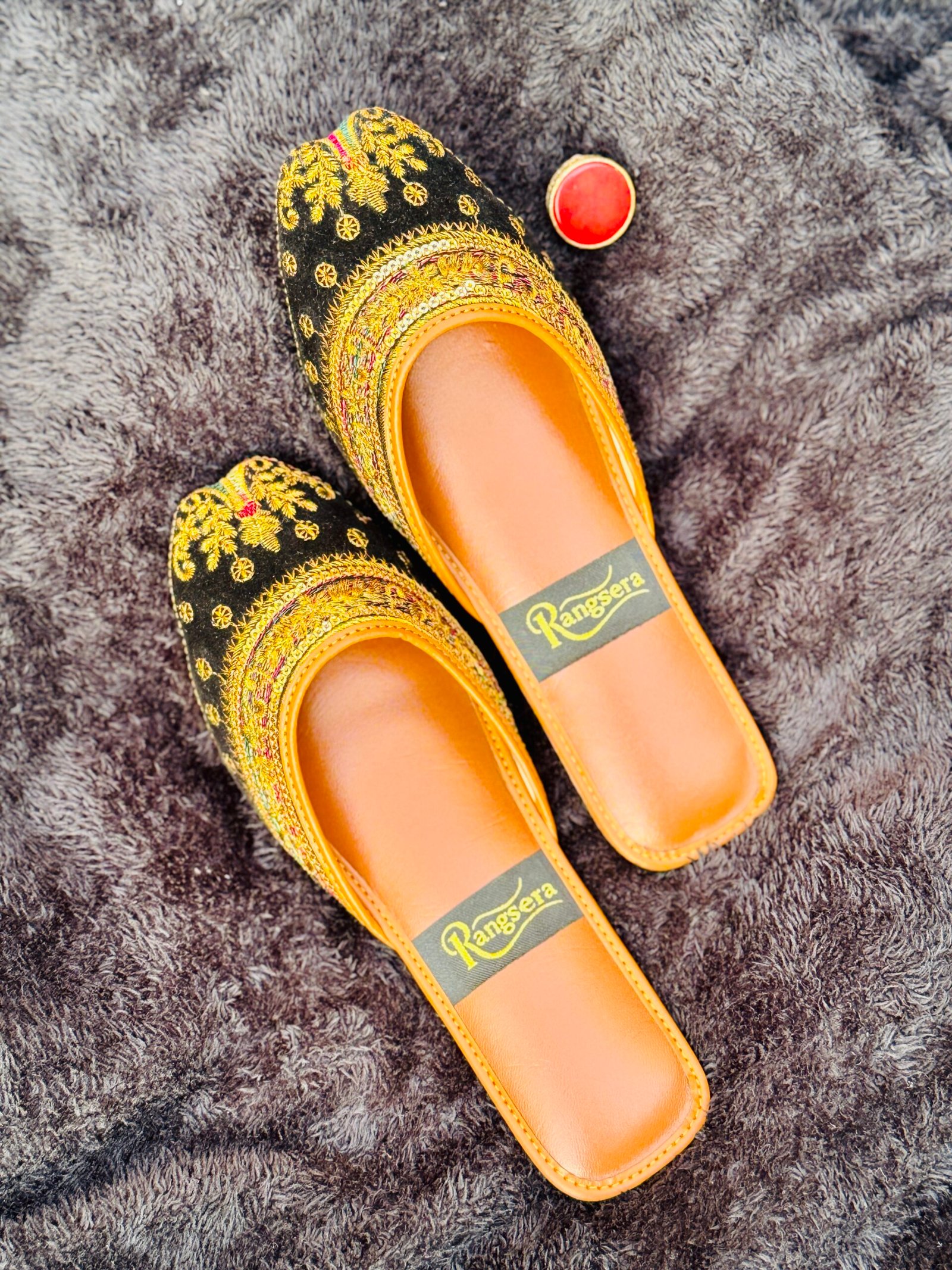 Rooted in classic craftsmanship, Zarveen is a timeless black khussa designed to elevate traditional elegance. Richly embroidered with intricate golden threadwork, this pair reflects heritage artistry with a refined finish. The deep black base enhances the detailing, while the soft, cushioned sole offers comfort throughout the day—making it a versatile choice for festive wear and formal occasions.