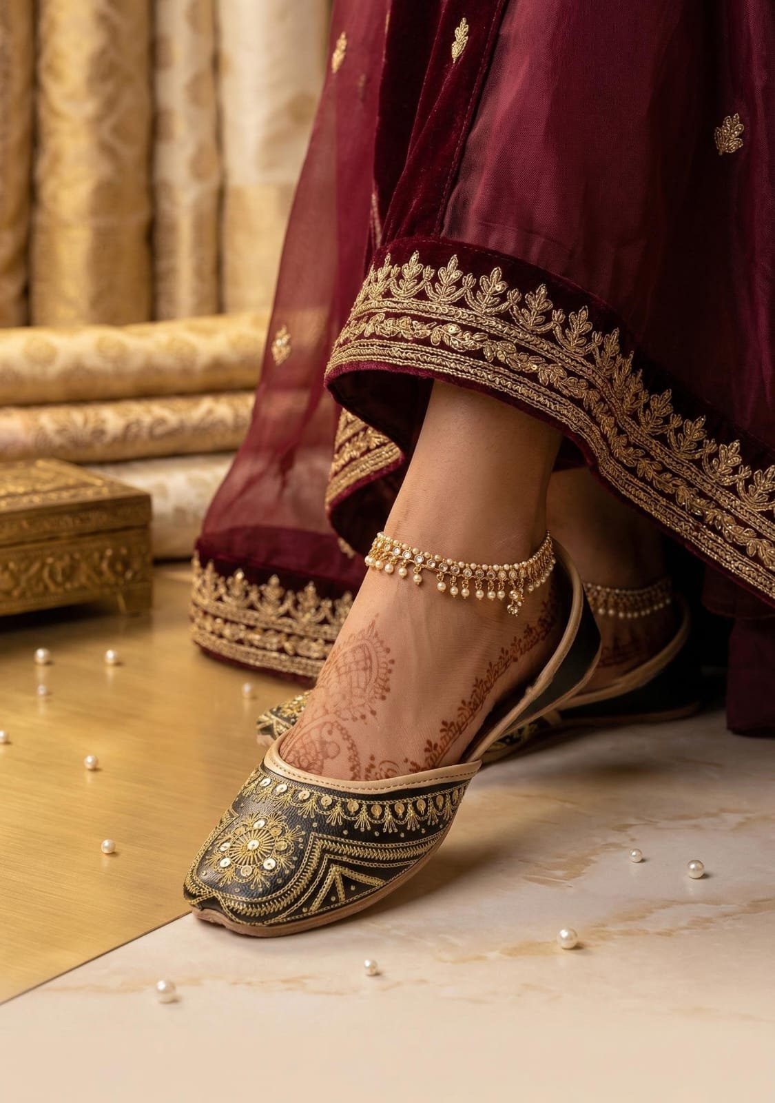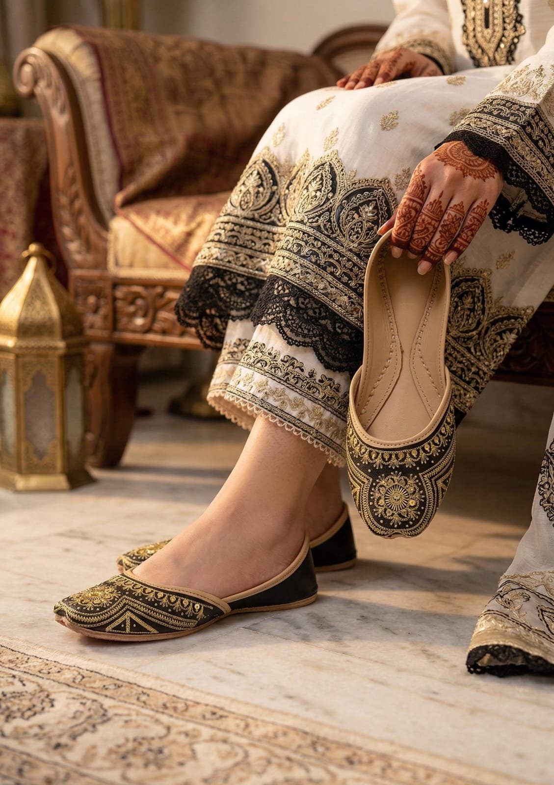Zeenat (Black Gold) is a stunning handcrafted khussa that reflects timeless elegance and rich traditional artistry. Designed on a classic black base, it features subtle golden accents that add a luxurious and festive touch. Perfect for weddings, formal events, and special occasions, this khussa blends style with all-day comfort.